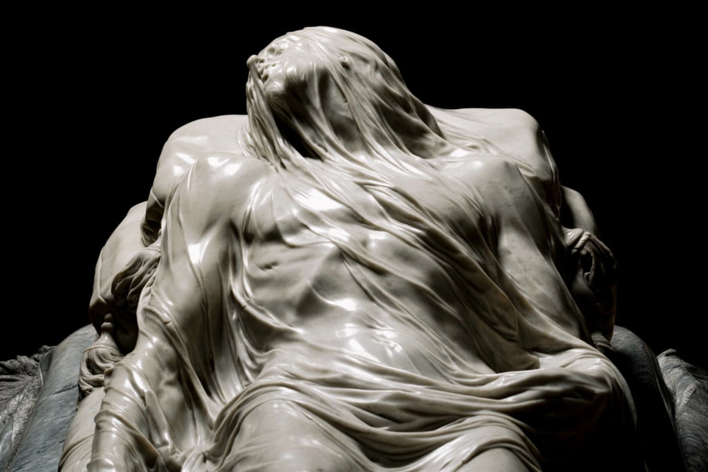 The modern sensitivity of the artist sculpts and divests the lifeless body of its flesh, which the soft shroud mercifully covers, on which the tormented, writhing rhythms of the folds of the veil engrave deep suffering, almost as if the compassionate covering made the poor limbs still more naked and exposed, and the lines of the tortured body even more inexorable and precise.