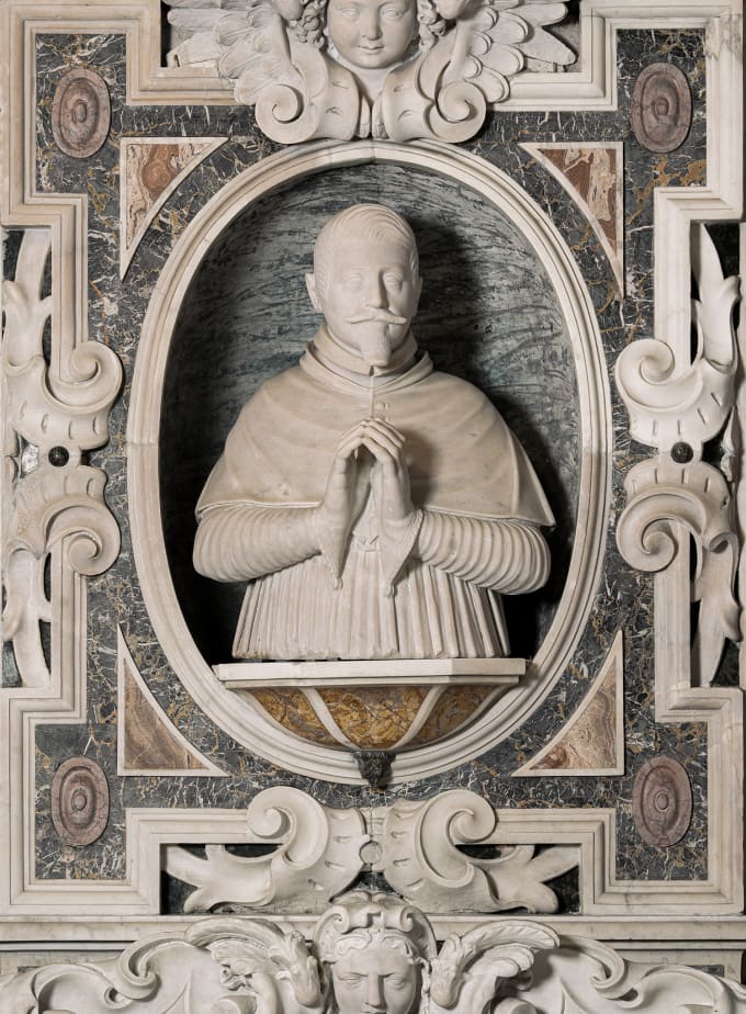 Autour du relief court un encadrement mixtiligne revêtu d’un matériau créé en laboratoire par Raimondo di Sangro, qui reproduit artificiellement le bleu outremer obtenu dans la nature à partir du précieux lapis-lazuli.
