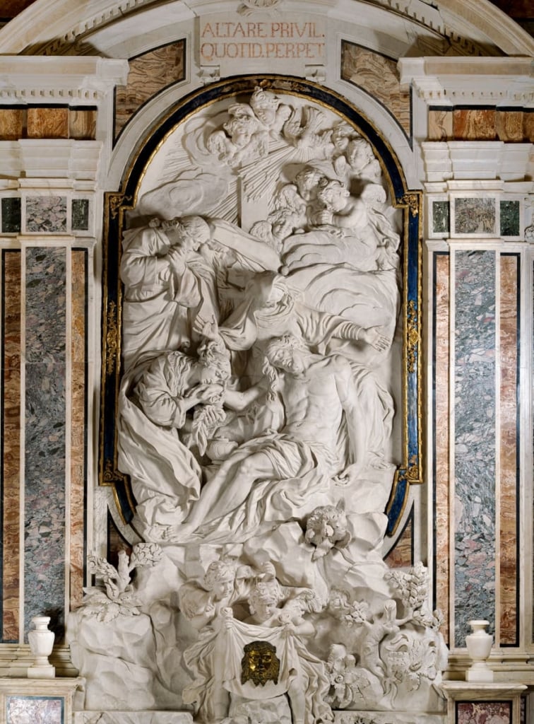 Au-dessous de la table, inséré dans un cadre végétal, un putto découvre un sépulcre vide. Sur les côtés des marches du Maître-Autel, se trouvent les deux Anges de Paolo Persico, aux draperies typiquement baroques, sculptées dans un marbre qui semble prendre vie.